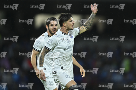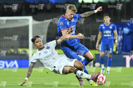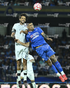 Ciudad de México, 24 de septiembre de 2025. Ángel Zapata y Carlos Rodríguez, durante el partido correspondiente a la jornada 10 del torneo Apertura 2025 de la Liga BBVA MX, entre la Máquina Celeste del Cruz Azul y los Gallos Blancos del Querétaro, realizado en el estadio Olímpico Universitario. Foto: Imago7/ Alexis Chavez