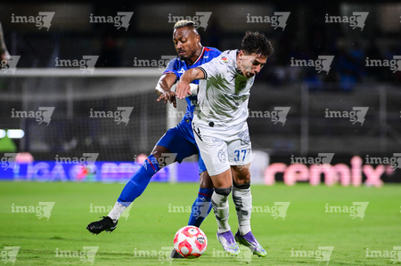 Ciudad de México, 24 de septiembre de 2025. Rodolfo Rotondi y Jhojan Julio Palacios, durante el partido correspondiente a la jornada 10 del torneo Apertura 2025 de la Liga BBVA MX, entre la Máquina Celeste del Cruz Azul y los Gallos Blancos del Querétaro, realizado en el estadio Olímpico Universitario. Foto: Imago7/ Manlio Contreras