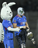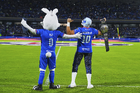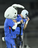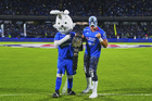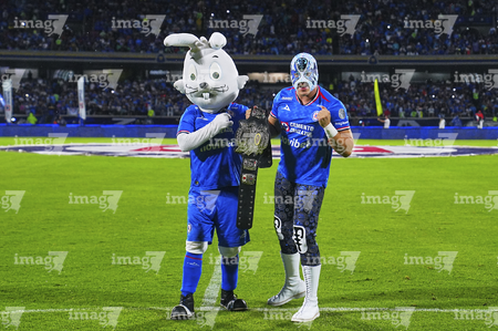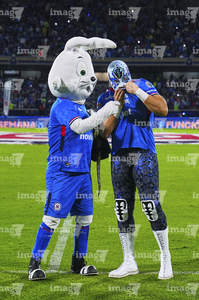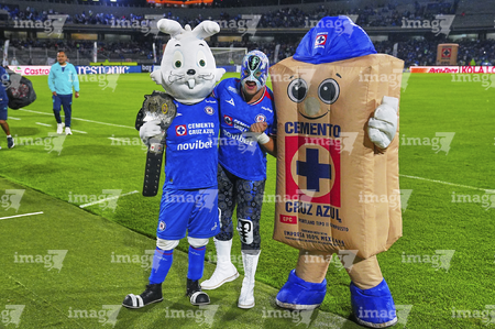 Ciudad de México, 24 de septiembre de 2025. Blu, Atlantis Jr. y Costalito, durante el partido correspondiente a la jornada 10 del torneo Apertura 2025 de la Liga BBVA MX, entre la Máquina Celeste del Cruz Azul y los Gallos Blancos del Querétaro, realizado en el estadio Olímpico Universitario. Foto: Imago7/ Manlio Contreras