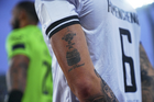 Ciudad de México, 24 de septiembre de 2025. Detalle de tatuaje de Santiago Homenchenko, durante el partido correspondiente a la jornada 10 del torneo Apertura 2025 de la Liga BBVA MX, entre la Máquina Celeste del Cruz Azul y los Gallos Blancos del Querétaro, realizado en el estadio Olímpico Universitario. Foto: Imago7/ Manlio Contreras