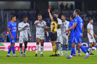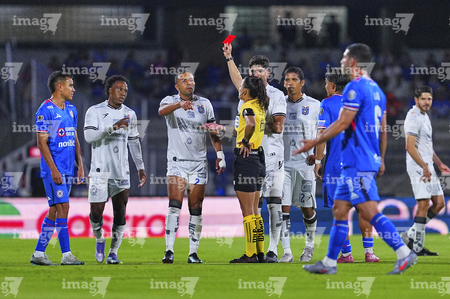 Ciudad de México, 24 de septiembre de 2025. Karen Hernández expulsa a Jhojan Julio Palacios, durante el partido correspondiente a la jornada 10 del torneo Apertura 2025 de la Liga BBVA MX, entre la Máquina Celeste del Cruz Azul y los Gallos Blancos del Querétaro, realizado en el estadio Olímpico Universitario. Foto: Imago7/ Manlio Contreras