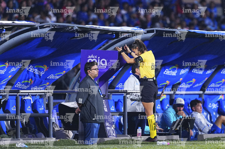 Ciudad de México, 24 de septiembre de 2025. Karen Hernández Andrade, árbitro central, consulta el sistema de video asistente del árbitro VAR durante el partido correspondiente a la jornada 10 del torneo Apertura 2025 de la Liga BBVA MX, entre la Máquina Celeste del Cruz Azul y los Gallos Blancos del Querétaro, realizado en el estadio Olímpico Universitario. Foto: Imago7/ Manlio Contreras