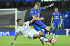Ciudad de México, 24 de septiembre de 2025. Ángel Zapata y Mateusz Bogusz, durante el partido correspondiente a la jornada 10 del torneo Apertura 2025 de la Liga BBVA MX, entre la Máquina Celeste del Cruz Azul y los Gallos Blancos del Querétaro, realizado en el estadio Olímpico Universitario. Foto: Imago7/Etzel Espinosa