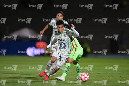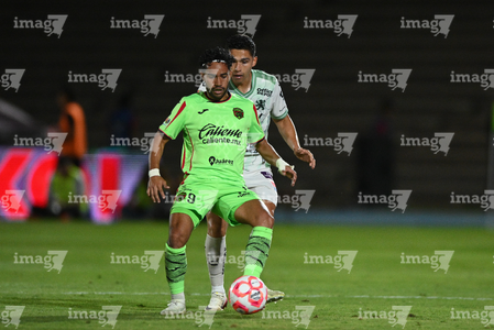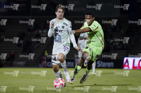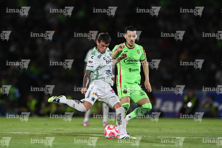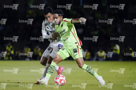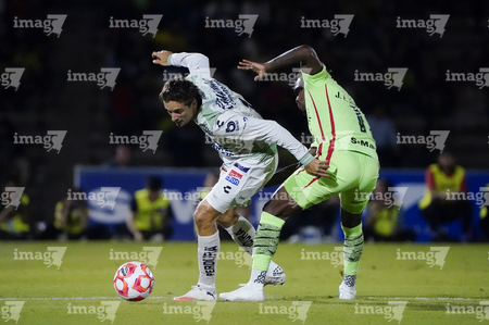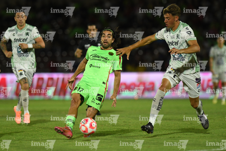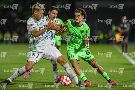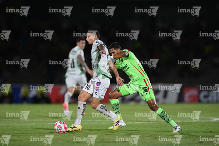 Ciudad Juárez, Chihuahua, 26 de septiembre de 2025. Salvador Reyes y Stiven Barreiro, durante el partido correspondiente a la jornada 11 del torneo Apertura 2025 de la Liga BBVA MX, entre los Bravos de FC Juárez y los Esmeraldas del León, realizado en realizado en el estadio Olímpico Benito Juárez. Foto: Imago7/Alejandro Rodríguez