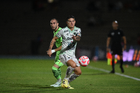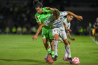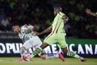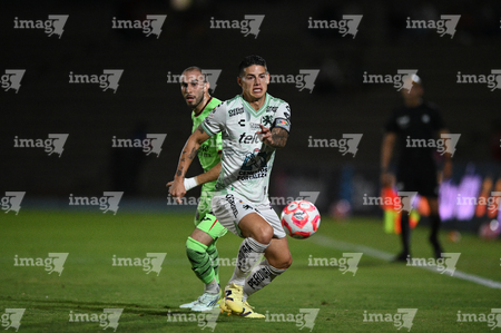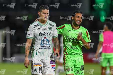 Ciudad Juárez, Chihuahua, 26 de septiembre de 2025. James Rodríguez y Homer Martinez, durante el partido correspondiente a la jornada 11 del torneo Apertura 2025 de la Liga BBVA MX, entre los Bravos de FC Juárez y los Esmeraldas del León, realizado en realizado en el estadio Olímpico Benito Juárez. Foto: Imago7/ José Zamora