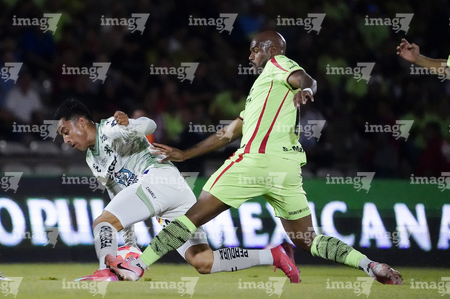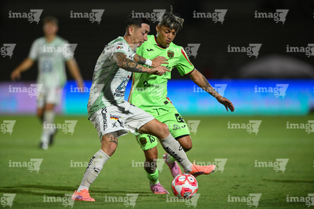 Ciudad Juárez, Chihuahua, 26 de septiembre de 2025. Miguel Rodríguez y Oscar Estupiñan, durante el partido correspondiente a la jornada 11 del torneo Apertura 2025 de la Liga BBVA MX, entre los Bravos de FC Juárez y los Esmeraldas del León, realizado en el estadio Olímpico Benito Juárez. Foto: Imago7/ Sebastian Laureano Miranda