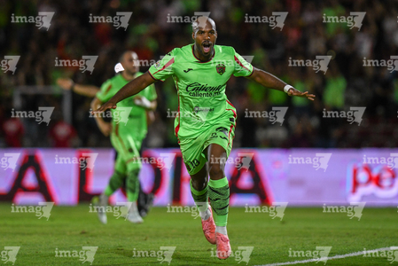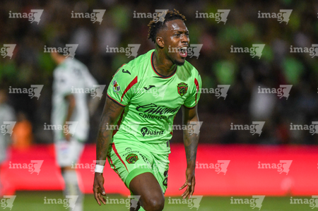 Ciudad Juárez, Chihuahua, 26 de septiembre de 2025. Oscar Estupiñan en festejo de gol, durante el partido correspondiente a la jornada 11 del torneo Apertura 2025 de la Liga BBVA MX, entre los Bravos de FC Juárez y los Esmeraldas del León, realizado en realizado en el estadio Olímpico Benito Juárez. Foto: Imago7/ José Zamora