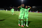 Ciudad Juárez, Chihuahua, 26 de septiembre de 2025. Oscar Estupiñán y Madson en festejo de gol, durante el partido correspondiente a la jornada 11 del torneo Apertura 2025 de la Liga BBVA MX, entre los Bravos de FC Juárez y los Esmeraldas del León, realizado en realizado en el estadio Olímpico Benito Juárez. Foto: Imago7/Alejandro Rodríguez
