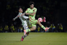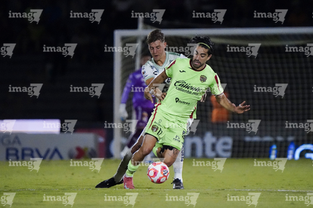 Ciudad Juárez, Chihuahua, 26 de septiembre de 2025. Valentín Gauthier Pereira y Rodolfo Pizarro, durante el partido correspondiente a la jornada 11 del torneo Apertura 2025 de la Liga BBVA MX, entre los Bravos de FC Juárez y los Esmeraldas del León, realizado en realizado en el estadio Olímpico Benito Juárez. Foto: Imago7/Alejandro Rodríguez
