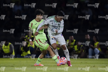 Ciudad Juárez, Chihuahua, 26 de septiembre de 2025. Rodrigo Echeverria y Raymundo Fulgencio, durante el partido correspondiente a la jornada 11 del torneo Apertura 2025 de la Liga BBVA MX, entre los Bravos de FC Juárez y los Esmeraldas del León, realizado en realizado en el estadio Olímpico Benito Juárez. Foto: Imago7/ José Zamora ç