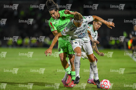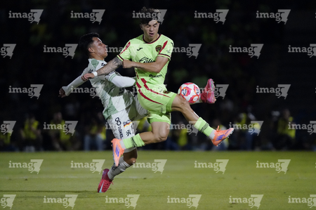 Ciudad Juárez, Chihuahua, 26 de septiembre de 2025. Nicolás Fonseca y Guilherme Castilho, durante el partido correspondiente a la jornada 11 del torneo Apertura 2025 de la Liga BBVA MX, entre los Bravos de FC Juárez y los Esmeraldas del León, realizado en realizado en el estadio Olímpico Benito Juárez. Foto: Imago7/ José Zamora
