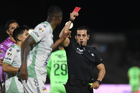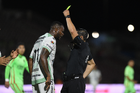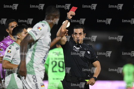 Ciudad Juárez, Chihuahua, 26 de septiembre de 2025. Mario Terrazas Chávez, Arbitro Central muestra tarjeta de expulsion a Stiven Barreiro, durante el partido correspondiente a la jornada 11 del torneo Apertura 2025 de la Liga BBVA MX, entre los Bravos de FC Juárez y los Esmeraldas del León, realizado en realizado en el estadio Olímpico Benito Juárez. Foto: Imago7/Alejandro Rodríguez