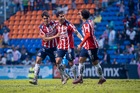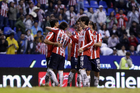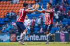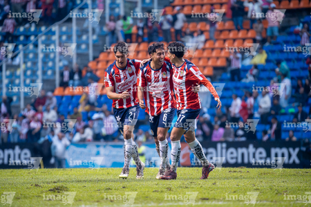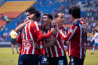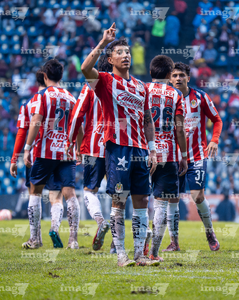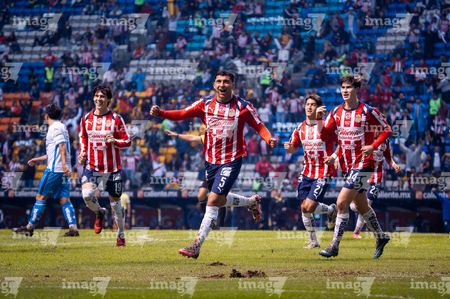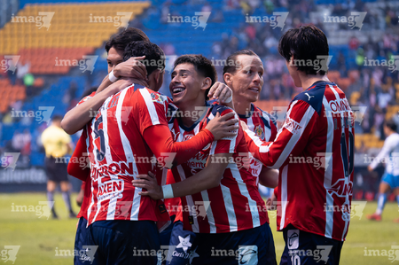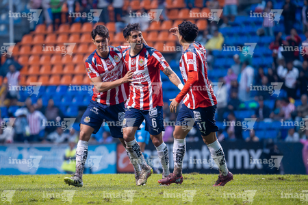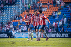 Puebla, Puebla, 27 de septiembre de 2025. Jugadores de Chivas en festejo de gol, durante el partido correspondiente a la jornada 11 del torneo Apertura 2025 de la Liga BBVA MX, entre el Club Puebla y las Chivas Rayadas del Guadalajara, realizado en el estadio Cuauhtémoc. Foto: Imago7/Mireya Novo