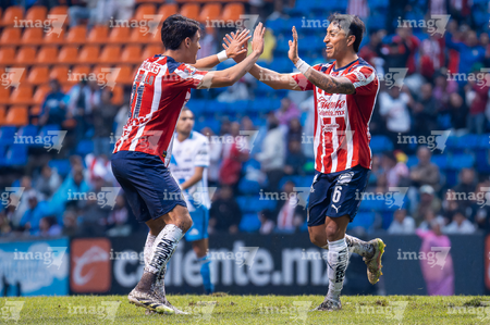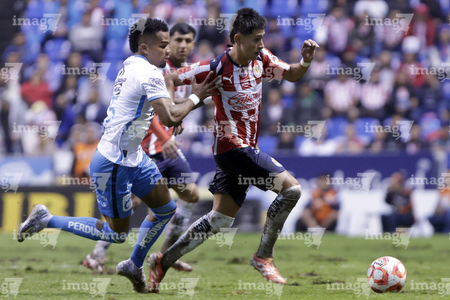 Puebla, Puebla, 27 de septiembre de 2025. José Castillo y , durante el partido correspondiente a la jornada 11 del torneo Apertura 2025 de la Liga BBVA MX, entre el Club Puebla y las Chivas Rayadas del Guadalajara, realizado en el estadio Cuauhtémoc. Foto: Imago7/Manlio Contreras