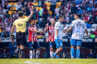 Puebla, Puebla, 27 de septiembre de 2025. Ismael Rosario López, árbitro central muestra tarjeta roja de expulsión, durante el partido correspondiente a la jornada 11 del torneo Apertura 2025 de la Liga BBVA MX, entre el Club Puebla y las Chivas Rayadas del Guadalajara, realizado en el estadio Cuauhtémoc. Foto: Imago7/Mireya Novo