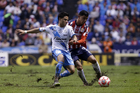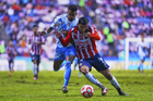 Puebla, Puebla, 27 de septiembre de 2025. Emiliano Gómez y José Castillo, durante el partido correspondiente a la jornada 11 del torneo Apertura 2025 de la Liga BBVA MX, entre el Club Puebla y las Chivas Rayadas del Guadalajara, realizado en el estadio Cuauhtémoc. Foto: Imago7/Diego Padilla