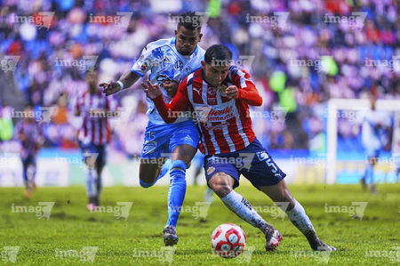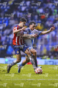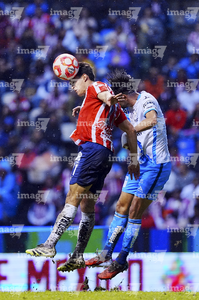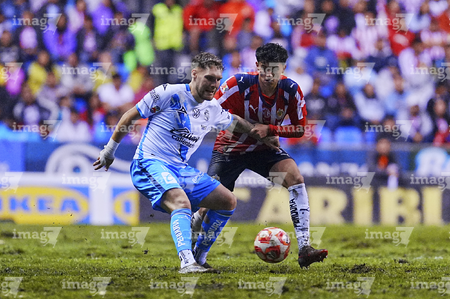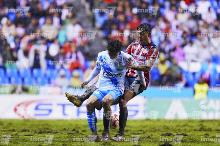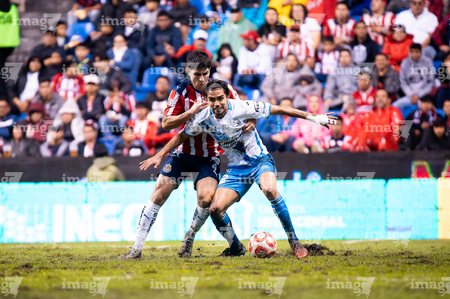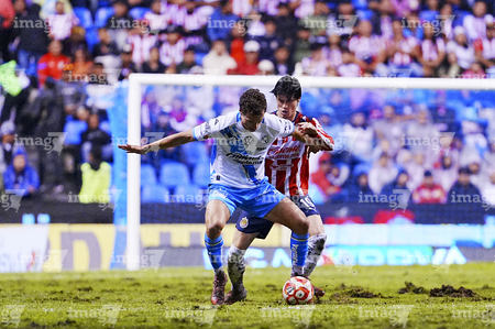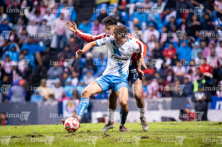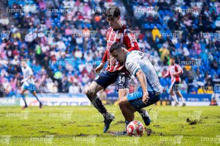 Puebla, Puebla, 27 de septiembre de 2025. Armando González y Nicolás Díaz, durante el partido correspondiente a la jornada 11 del torneo Apertura 2025 de la Liga BBVA MX, entre el Club Puebla y las Chivas Rayadas del Guadalajara, realizado en el estadio Cuauhtémoc. Foto: Imago7/Diego Padilla