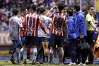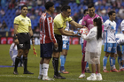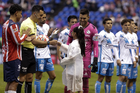 Puebla, Puebla, 27 de septiembre de 2025. Jugadores del Club Puebla y Jugadores de Chivas en conato de bronca, durante el partido correspondiente a la jornada 11 del torneo Apertura 2025 de la Liga BBVA MX, entre el Club Puebla y las Chivas Rayadas del Guadalajara, realizado en el estadio Cuauhtémoc. Foto: Imago7/Mireya Novo