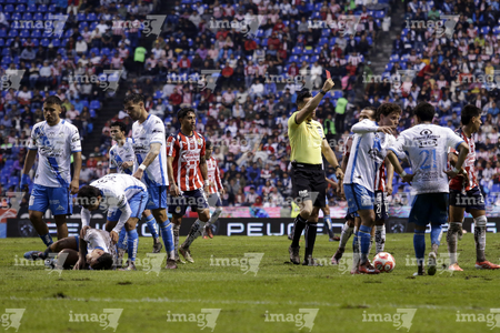 Puebla, Puebla, 27 de septiembre de 2025. Jugada en Revision de VAR, durante el partido correspondiente a la jornada 11 del torneo Apertura 2025 de la Liga BBVA MX, entre el Club Puebla y las Chivas Rayadas del Guadalajara, realizado en el estadio Cuauhtémoc. Foto: Imago7/Diego Padilla
