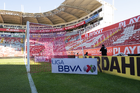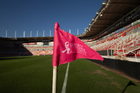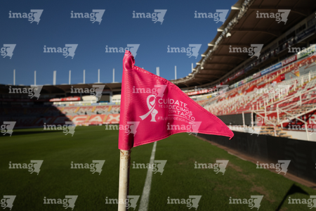 Aguascalientes, Aguascalientes, 21 de octubre de 2025. Banderin de tiro de esquina de la Campaña Rosa para la concientización del Cáncer de Mama, durante el partido correspondiente a la jornada 14 del torneo Apertura 2025 de la Liga BBVA MX, entre los Rayos del Necaxa y la Máquina Celeste del Cruz Azul, realizado en el estadio Victoria. Foto: Imago7/ Pablo Ramírez