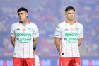 Aguascalientes, Aguascalientes, 21 de octubre de 2025. Amaury Morales y Franco Rossano, durante el partido correspondiente a la jornada 14 del torneo Apertura 2025 de la Liga BBVA MX, entre los Rayos del Necaxa y la Máquina Celeste del Cruz Azul, realizado en el estadio Victoria. Foto: Imago7/ Rogelio Davila