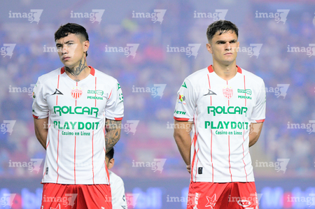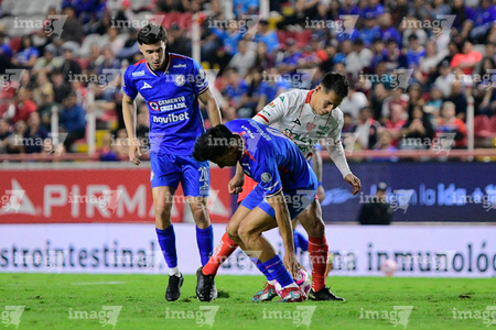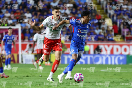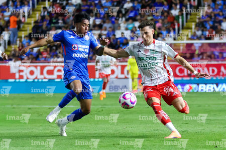 Aguascalientes, Aguascalientes, 21 de octubre de 2025. Amaury García y Tomas Badaloni, durante el partido correspondiente a la jornada 14 del torneo Apertura 2025 de la Liga BBVA MX, entre los Rayos del Necaxa y la Máquina Celeste del Cruz Azul, realizado en el estadio Victoria. Foto: Imago7/ Rogelio Davila