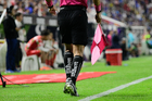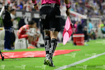 Aguascalientes, Aguascalientes, 21 de octubre de 2025. Bandera del árbitro asistente de la Campaña Rosa para la concientización del Cáncer de Mama, durante el partido correspondiente a la jornada 14 del torneo Apertura 2025 de la Liga BBVA MX, entre los Rayos del Necaxa y la Máquina Celeste del Cruz Azul, realizado en el estadio Victoria. Foto: Imago7/ Pablo Ramírez