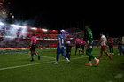 Aguascalientes, Aguascalientes, 21 de octubre de 2025. Protocolo de la Campaña Rosa para la concientización del Cáncer de Mama, durante el partido correspondiente a la jornada 14 del torneo Apertura 2025 de la Liga BBVA MX, entre los Rayos del Necaxa y la Máquina Celeste del Cruz Azul, realizado en el estadio Victoria. Foto: Imago7/ Pablo Ramírez