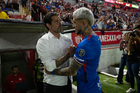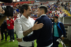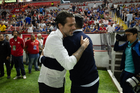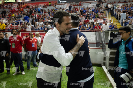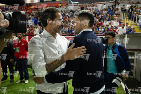 Aguascalientes, Aguascalientes, 21 de octubre de 2025. Fernando Gago y Nicolás Larcamón, durante el partido correspondiente a la jornada 14 del torneo Apertura 2025 de la Liga BBVA MX, entre los Rayos del Necaxa y la Máquina Celeste del Cruz Azul, realizado en el estadio Victoria. Foto: Imago7/ Pablo Ramírez