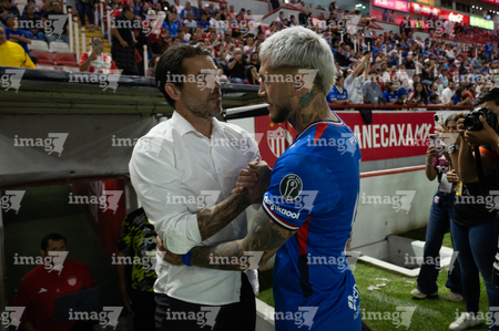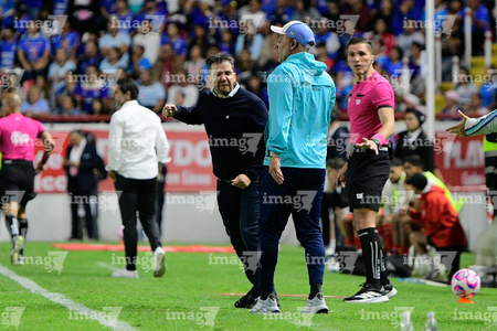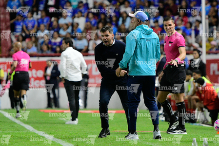 Aguascalientes, Aguascalientes, 21 de octubre de 2025. Nicolas Larcamón y Agustin Palavecino, durante el partido correspondiente a la jornada 14 del torneo Apertura 2025 de la Liga BBVA MX, entre los Rayos del Necaxa y la Máquina Celeste del Cruz Azul, realizado en el estadio Victoria. Foto: Imago7/ Rogelio Davila