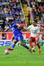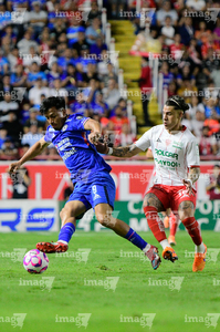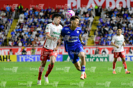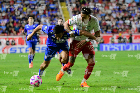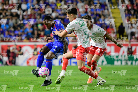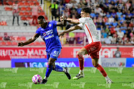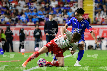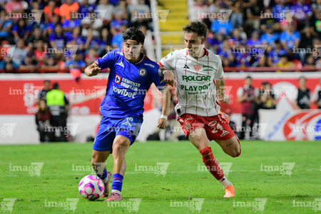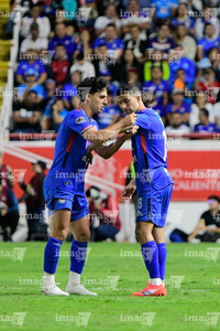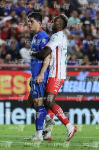 Aguascalientes, Aguascalientes, 21 de octubre de 2025. Emilio Lara y Angel Sepulveda, durante el partido correspondiente a la jornada 14 del torneo Apertura 2025 de la Liga BBVA MX, entre los Rayos del Necaxa y la Máquina Celeste del Cruz Azul, realizado en el estadio Victoria. Foto: Imago7/ Pablo Ramírez