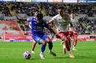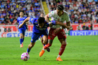 Aguascalientes, Aguascalientes, 21 de octubre de 2025. Ángel Sepúlveda y José Iván Rodríguez, durante el partido correspondiente a la jornada 14 del torneo Apertura 2025 de la Liga BBVA MX, entre los Rayos del Necaxa y la Máquina Celeste del Cruz Azul, realizado en el estadio Victoria. Foto: Imago7/ Pablo Ramírez