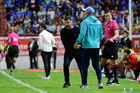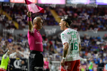 Aguascalientes, Aguascalientes, 21 de octubre de 2025. Cristian Calderón "Chicote" en reclamo a José Ibrahim Martínez, árbitro asistente, durante el partido correspondiente a la jornada 14 del torneo Apertura 2025 de la Liga BBVA MX, entre los Rayos del Necaxa y la Máquina Celeste del Cruz Azul, realizado en el estadio Victoria. Foto: Imago7/ Pablo Ramírez
