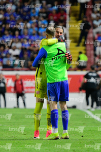 Aguascalientes, Aguascalientes, 21 de octubre de 2025. Luis Unsain y Rodolfo Rotondi, durante el partido correspondiente a la jornada 14 del torneo Apertura 2025 de la Liga BBVA MX, entre los Rayos del Necaxa y la Máquina Celeste del Cruz Azul, realizado en el estadio Victoria. Foto: Imago7/ Pablo Ramírez