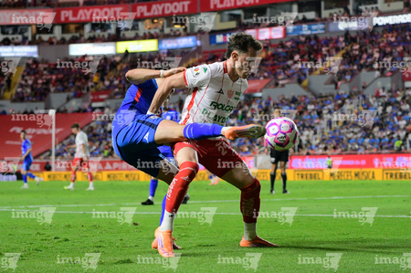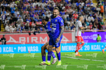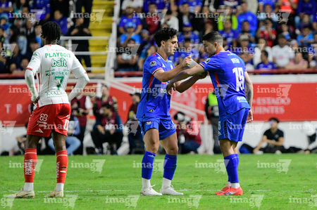 Aguascalientes, Aguascalientes, 21 de octubre de 2025. Tomas Jacob y Amaury Morales, durante el partido correspondiente a la jornada 14 del torneo Apertura 2025 de la Liga BBVA MX, entre los Rayos del Necaxa y la Máquina Celeste del Cruz Azul, realizado en el estadio Victoria. Foto: Imago7/ Rogelio Davila