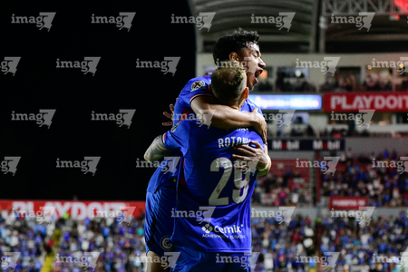 Aguascalientes, Aguascalientes, 21 de octubre de 2025. Cristian Calderón y Amaury Morales, durante el partido correspondiente a la jornada 14 del torneo Apertura 2025 de la Liga BBVA MX, entre los Rayos del Necaxa y la Máquina Celeste del Cruz Azul, realizado en el estadio Victoria. Foto: Imago7/ Pablo Ramírez