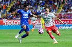 Aguascalientes, Aguascalientes, 21 de octubre de 2025. Cristian Calderón (D), durante el partido correspondiente a la jornada 14 del torneo Apertura 2025 de la Liga BBVA MX, entre los Rayos del Necaxa y la Máquina Celeste del Cruz Azul, realizado en el estadio Victoria. Foto: Imago7/ Pablo Ramírez