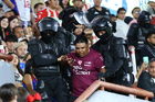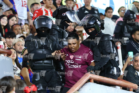 Aguascalientes, Aguascalientes, 21 de octubre de 2025. Un aficionado es retirado del estadio, durante el partido correspondiente a la jornada 14 del torneo Apertura 2025 de la Liga BBVA MX, entre los Rayos del Necaxa y la Máquina Celeste del Cruz Azul, realizado en el estadio Victoria. Foto: Imago7/ Rogelio Davila