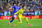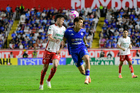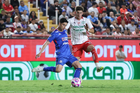 Aguascalientes, Aguascalientes, 21 de octubre de 2025. Amaury Morales y Franco Rossano, durante el partido correspondiente a la jornada 14 del torneo Apertura 2025 de la Liga BBVA MX, entre los Rayos del Necaxa y la Máquina Celeste del Cruz Azul, realizado en el estadio Victoria. Foto: Imago7/ Pablo Ramírez