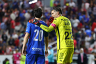 Aguascalientes, Aguascalientes, 21 de octubre de 2025. José Paradela y Luis Unsain, durante el partido correspondiente a la jornada 14 del torneo Apertura 2025 de la Liga BBVA MX, entre los Rayos del Necaxa y la Máquina Celeste del Cruz Azul, realizado en el estadio Victoria. Foto: Imago7/ Rogelio Davila