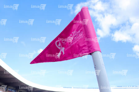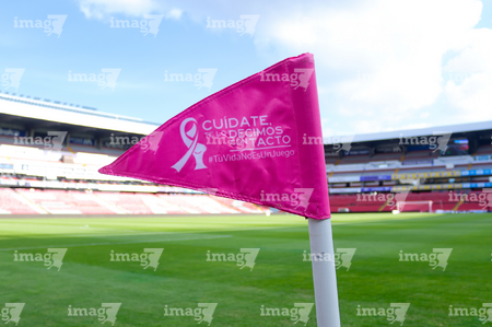 Querétaro, Querétaro, 22 de octubre de 2025. Banderin de tiro de esquina de la Campaña Rosa para la concientización del Cáncer de Mama, durante el partido correspondiente a la jornada 14 del torneo Apertura 2025 de la Liga BBVA MX, entre los Gallos Blancos del Querétaro y las Chivas Rayadas del Guadalajara, realizado en el estadio La Corregidora. Foto: Imago7/ Hugo Martinez
