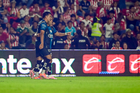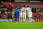 Querétaro, Querétaro, 22 de octubre de 2025. Jugadores de Chivas, durante el partido correspondiente a la jornada 14 del torneo Apertura 2025 de la Liga BBVA MX, entre los Gallos Blancos del Querétaro y las Chivas Rayadas del Guadalajara, realizado en el estadio La Corregidora. Foto: Imago7/ Hugo Martinez