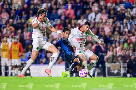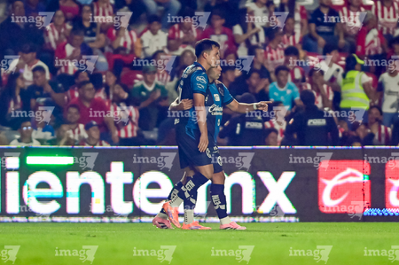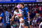 Querétaro, Querétaro, 22 de octubre de 2025. Armando González y Santiago Homenchenko, durante el partido correspondiente a la jornada 14 del torneo Apertura 2025 de la Liga BBVA MX, entre los Gallos Blancos del Querétaro y las Chivas Rayadas del Guadalajara, realizado en el estadio La Corregidora. Foto: Imago7/
