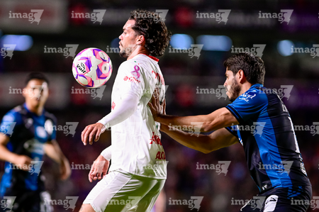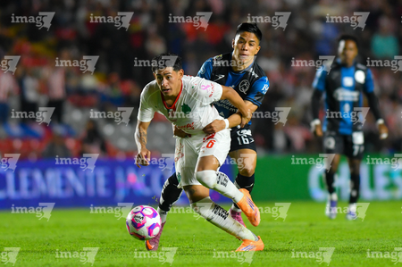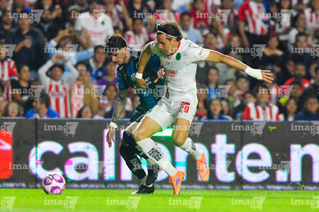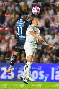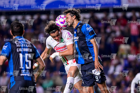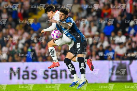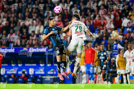 Querétaro, Querétaro, 22 de octubre de 2025. Hugo Camberos y Jaime Gómez, durante el partido correspondiente a la jornada 14 del torneo Apertura 2025 de la Liga BBVA MX, entre los Gallos Blancos del Querétaro y las Chivas Rayadas del Guadalajara, realizado en el estadio La Corregidora. Foto: Imago7/