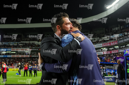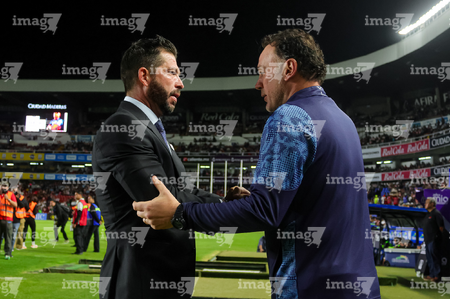 Querétaro, Querétaro, 22 de octubre de 2025. Benjamín Mora, director técnico y Gabriel Milito, director técnico, durante el partido correspondiente a la jornada 14 del torneo Apertura 2025 de la Liga BBVA MX, entre los Gallos Blancos del Querétaro y las Chivas Rayadas del Guadalajara, realizado en el estadio La Corregidora. Foto: Imago7/ Hugo Martinez