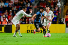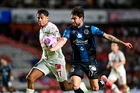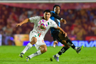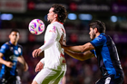 Querétaro, Querétaro, 22 de octubre de 2025. Cade Cowell y Rodrigo Bogarin, durante el partido correspondiente a la jornada 14 del torneo Apertura 2025 de la Liga BBVA MX, entre los Gallos Blancos del Querétaro y las Chivas Rayadas del Guadalajara, realizado en el estadio La Corregidora. Foto: Imago7/ Hugo Martinez