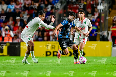 Querétaro, Querétaro, 22 de octubre de 2025. Teun Wilke, Jaime Gómez y Bryan González, durante el partido correspondiente a la jornada 14 del torneo Apertura 2025 de la Liga BBVA MX, entre los Gallos Blancos del Querétaro y las Chivas Rayadas del Guadalajara, realizado en el estadio La Corregidora. Foto: Imago7/ Hugo Martinez