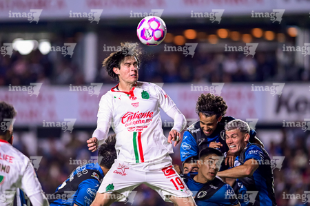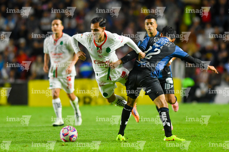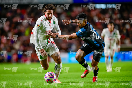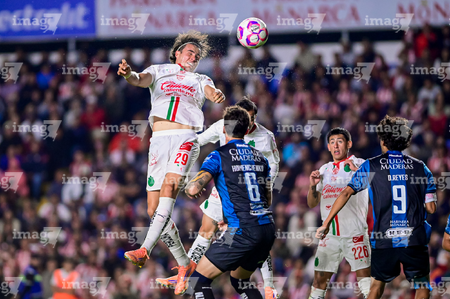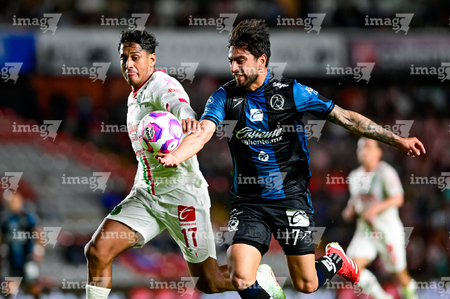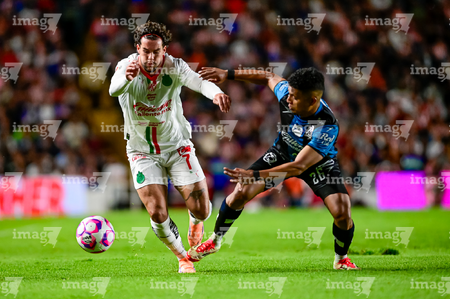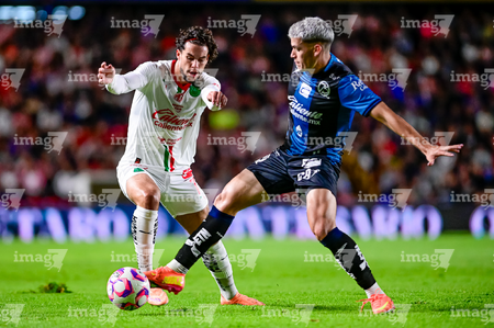 Querétaro, Querétaro, 22 de octubre de 2025. Santiago Sandoval y Ángel Zapata, durante el partido correspondiente a la jornada 14 del torneo Apertura 2025 de la Liga BBVA MX, entre los Gallos Blancos del Querétaro y las Chivas Rayadas del Guadalajara, realizado en el estadio La Corregidora. Foto: Imago7/
