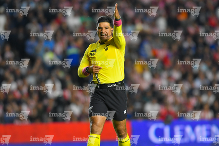 Querétaro, Querétaro, 22 de octubre de 2025. Maximiliano Quintero Hernández, árbitro central, durante el partido correspondiente a la jornada 14 del torneo Apertura 2025 de la Liga BBVA MX, entre los Gallos Blancos del Querétaro y las Chivas Rayadas del Guadalajara, realizado en el estadio La Corregidora. Foto: Imago7/