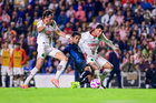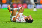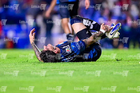 Querétaro, Querétaro, 22 de octubre de 2025. Santiago Homenchenko resultó lesionado, durante el partido correspondiente a la jornada 14 del torneo Apertura 2025 de la Liga BBVA MX, entre los Gallos Blancos del Querétaro y las Chivas Rayadas del Guadalajara, realizado en el estadio La Corregidora. Foto: Imago7/ Hugo Martinez